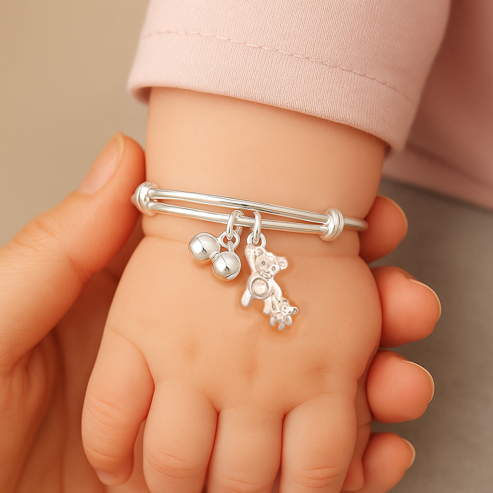 大熊和小熊代表親密的陪伴與守護,搖鈴的輕聲象徵幸福與平安的祝福。這款手鐲祈願寶寶在成長的每一步都被愛與喜悅包圍,帶來無憂無慮的童年時光,也為家庭增添幸福的聲音。